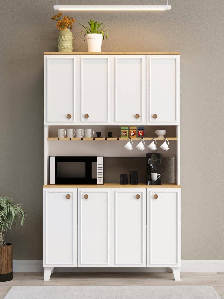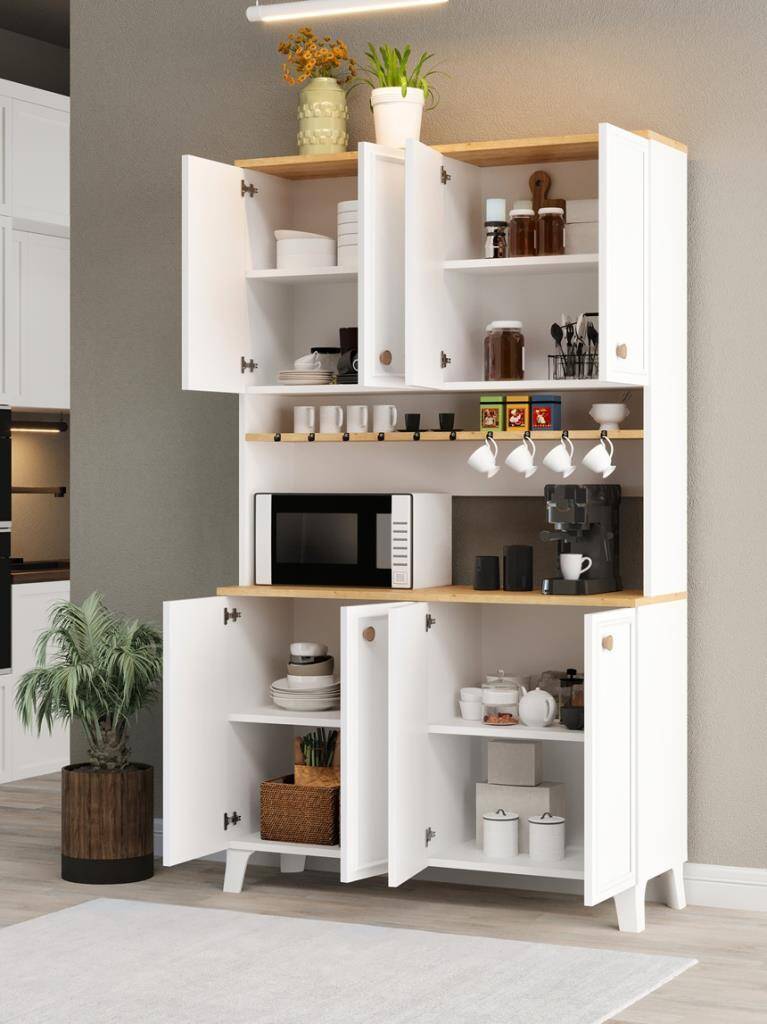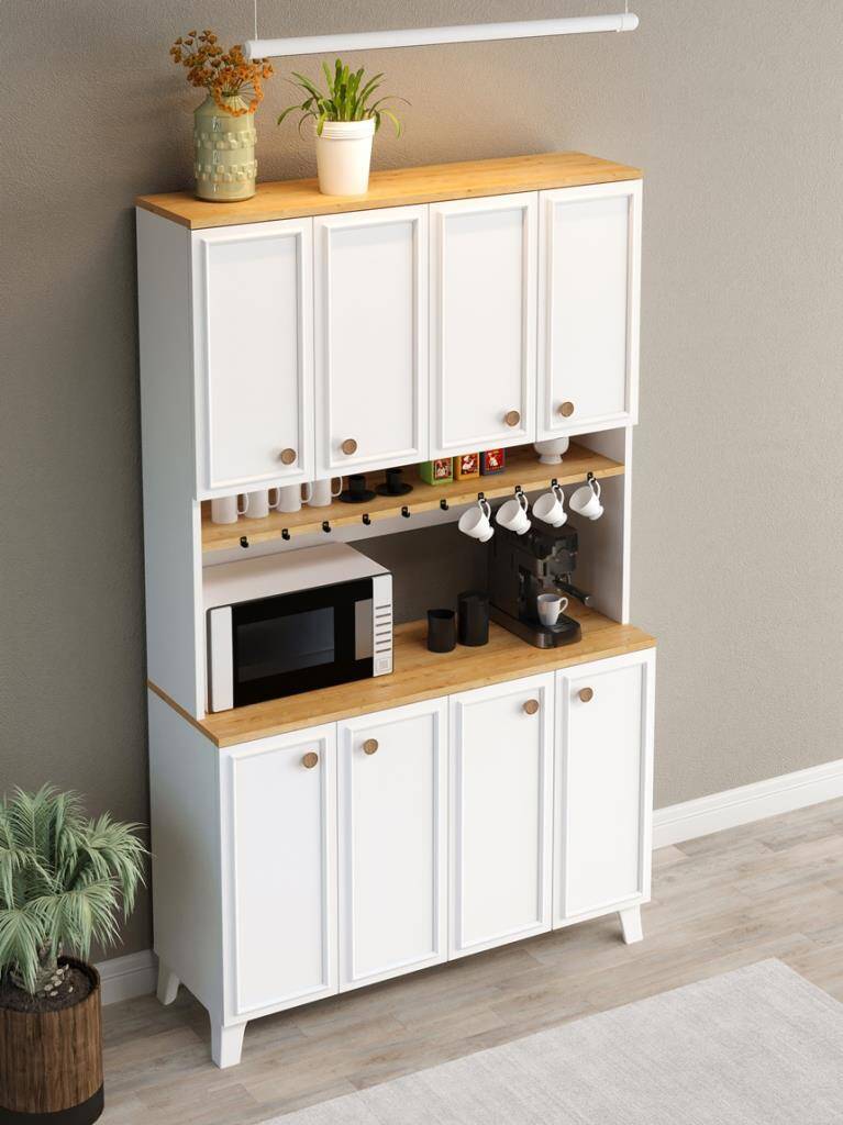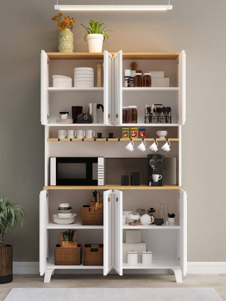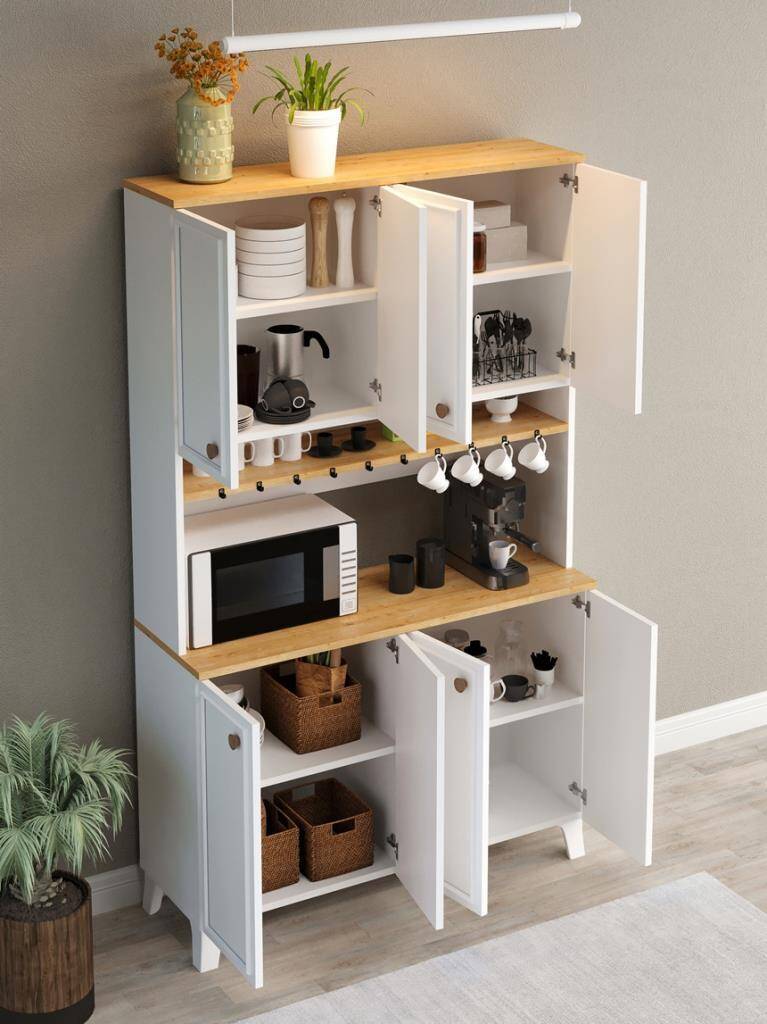Mutfakta düzen sağlayan, mikrodalga ve kahve makinesi için özel alanı olan, fincan askılı ve kapaklı geniş depolama sunan şık çok amaçlı dolap.